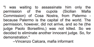 The informant Calcara, who gave testimony against the art dealer, is a former protege of Francesco Messina Denaro of the Castelvetrano family and has faced his own legal dramas related to his involvement in international drug trafficking and money laundering, some underworld activities which purportedly also implicated the Vatican bank. Verbose mafia defector Calcara’s claims of self importance, and connections to the upper echelons of the mafia, have lethal overtones. In the passed he has said he was originally tasked with killing antimafia Judge Paolo Borsellino in September 1991 with a sniper rifle but was arrested before he could carry out the plot.