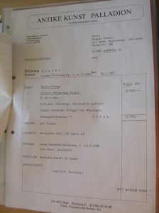 On the right, Christie’s lot 126 (Greek vase), is depicted (right) and as it was found in the Becchina archive (left), before conservation and restoration, with encrustations and a quite distinctive flake missing from its center of the decoration; comparing it with the Christie’s catalogue image, the encrustations have been removed, the vase is clean, and the missing flake coloured over with black paint. Moreover, the invoice from Becchina to Termer (third image), which was discovered in the Becchina archive, is shown; this connects the vase to a notorious and convicted illicit antiquities dealer (Becchina), and disproving the date in which the final transaction between Becchina and Termer took place (not 1986 as Christie’s state, but 1987, as the invoice states, although a ‘pro forma’ invoice dated 12/12/1986 is also mentioned). Christie’s, once again, fail to refer to the earliest provenance of an antiquity, which usually, when identified, coincides to be a known trafficker.