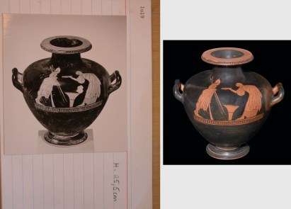 Greek vase, as seen at Christie’s (screenshot, Nov. 28, 2011) (right) and as it was found in the Becchina archive (left)