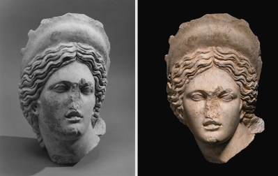 Aphrodite’s head from the confiscated Symes and Michaelides archive (left) and from a screenshot from Sotheby’s (Nov. 28, 2018)
